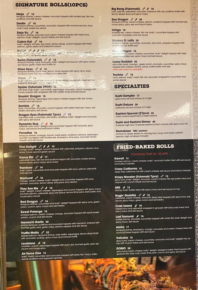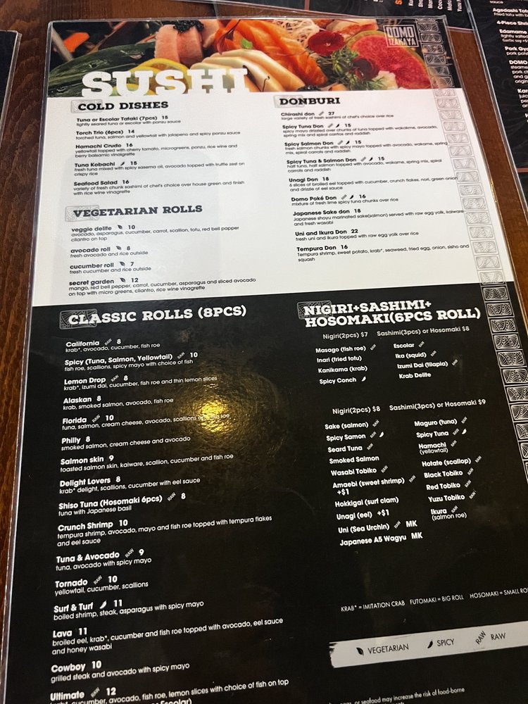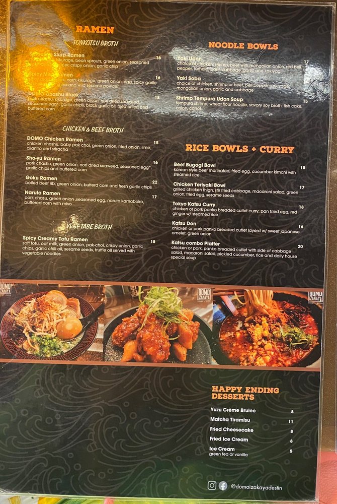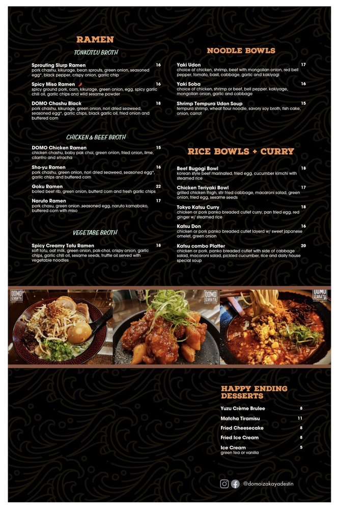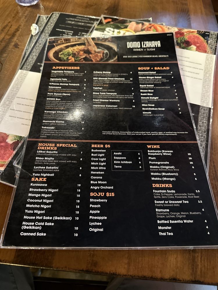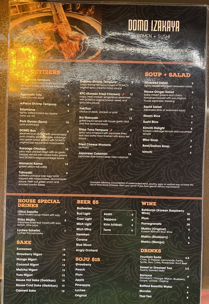 Domo Izakaya is a trendy sushi bar and izakaya in Destin, FL, offering delivery, takeout, and outdoor seating. Known for its casual and hipster ambiance, it is perfect for groups and provides waiter service. The menu features a variety of appetizers like vegetable tempura, agedashi tofu, and pork gyoza. Cold dishes like tuna tataki and escolar tataki offer a refreshing option. Classic rolls like the California roll and Alaskan roll are popular choices. Customers praise the wonderful service, delicious food, and peaceful ambiance with anime decor. While some have mentioned longer wait times, the overall experience at Domo Izakaya is deemed fantastic, especially highlighted by dishes like Domo Chicken Ramen and Salmon Sashimi. The affordable drinks and Asian cuisine variety make it a must-visit spot for lovers of Japanese cuisine.